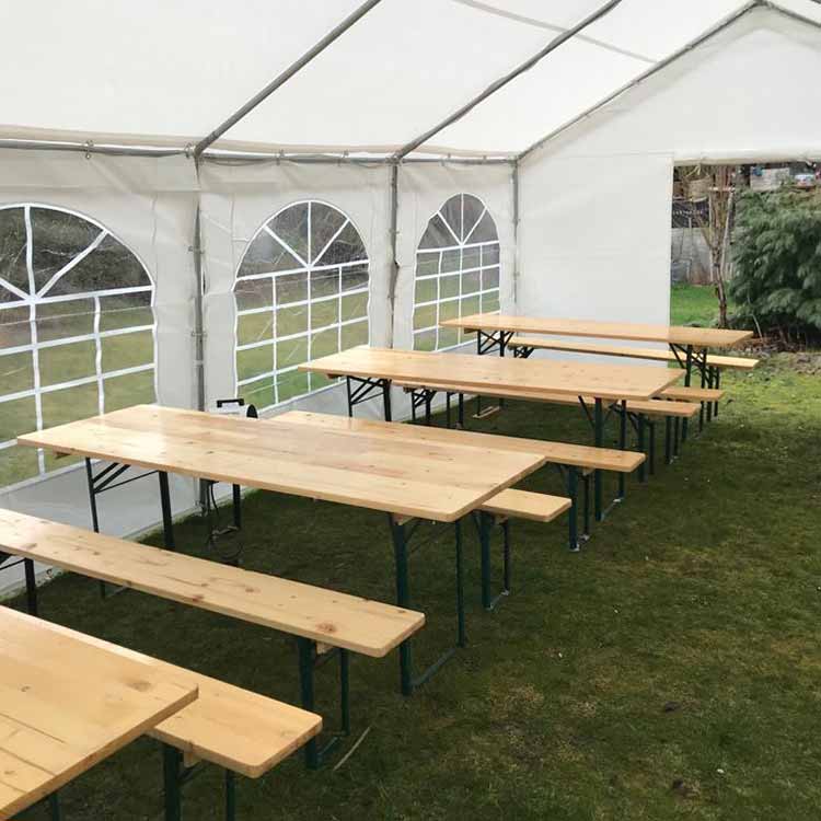 Verleih von Bierzeltgarnituren. Wir bieten Ihnen alles für Ihre Veranstaltung – direkt aus einer Hand. Egal ob Sie Biergarten-Stimmung auf Ihrer Gartenparty versprühen möchten oder eine praktische Sitzgelegenheit für den Geburtstag suchen. Unsere Sets sind auch als Hochzeitsmobiliar geeignet. Die Bierzeltgarnitur ist stabil und wetterbeständig. Sie ist für jede Art von Anlässen, drinnen und draußen einsetzbar. Als Sitzgelegenheit für Ihre Gäste ist das dreiteiliges Set aus Biertisch und zwei Bänken daher die richtige, vielfältige Lösung.